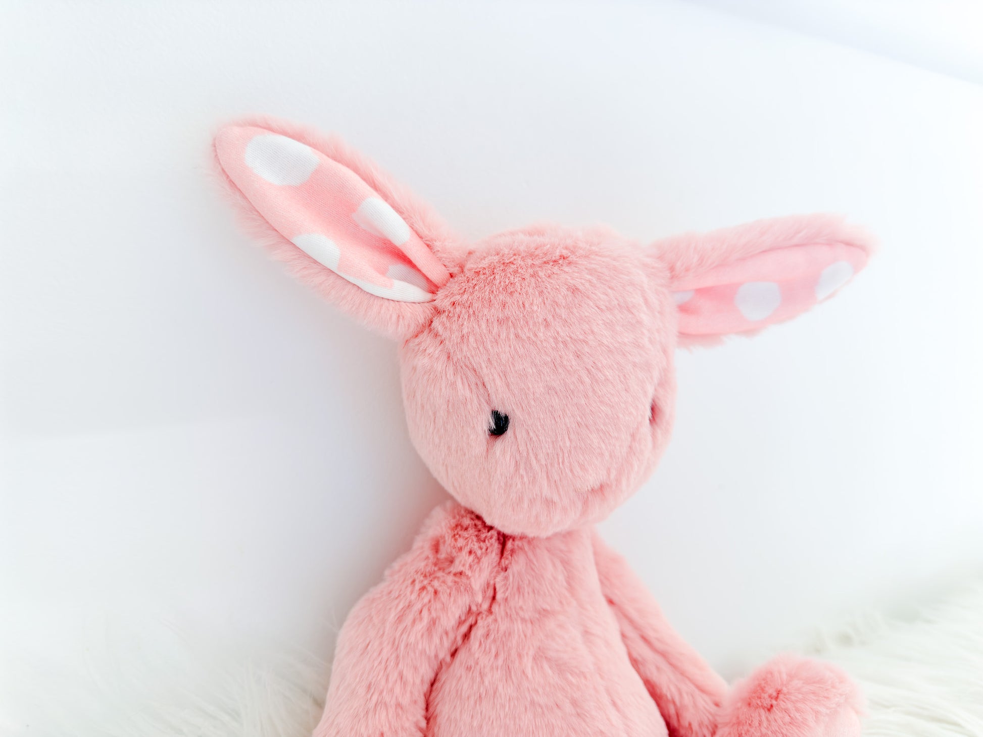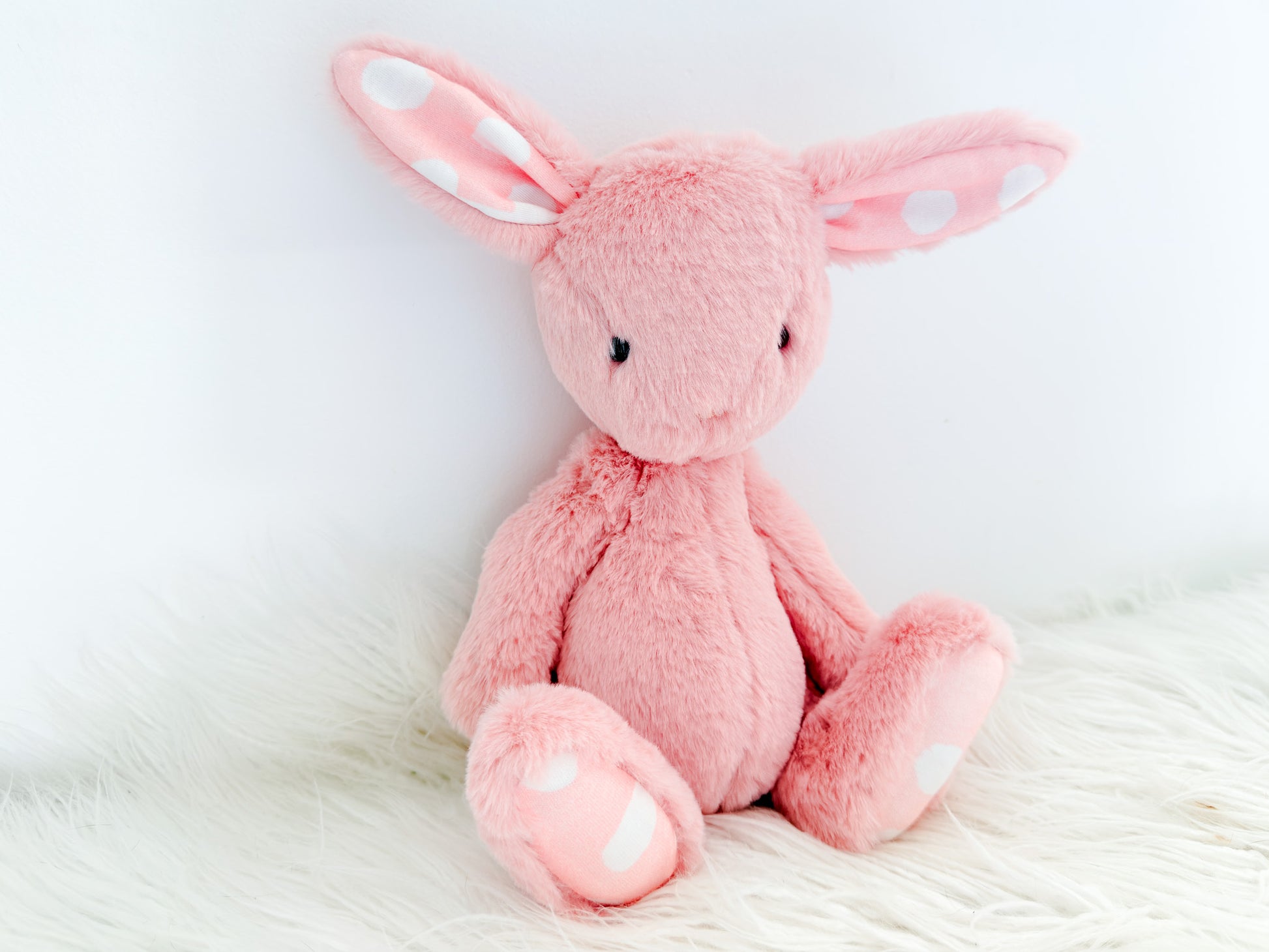 Say hello to our beautiful Blush Polka Dot Snuggle Bunny, a soft and cuddly companion designed to bring comfort, joy, and sweetness to little ones. Made from ultra-plush blush pink fur with adorable white polka dot accents on the ears and paws, she’s irresistibly huggable and perfect for snuggle time.