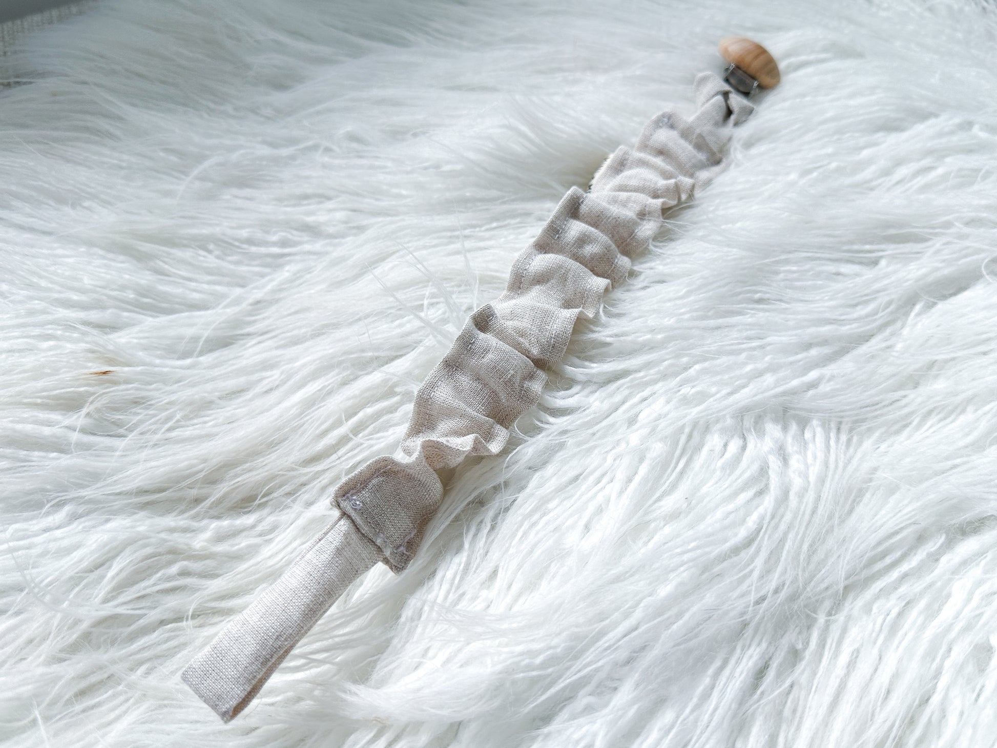 These super cute dummy clips are perfect for every day use. Just simply clip the wooden clip to your babies clothing to prevent their dummy getting dirty by falling on the ground or floor. Made with organic linen and a natural wooden clip.