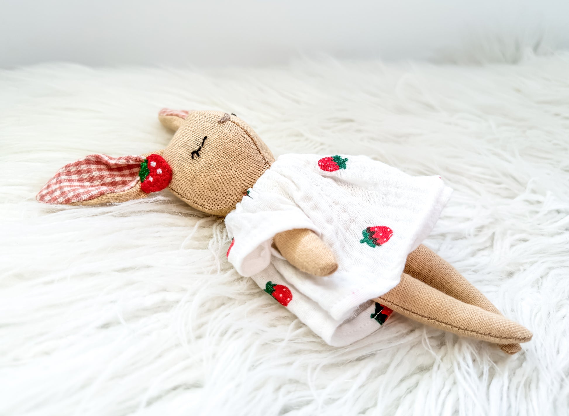 Handmade Linen Bunny Mini Doll – Strawberry Dress & Gingham Ears