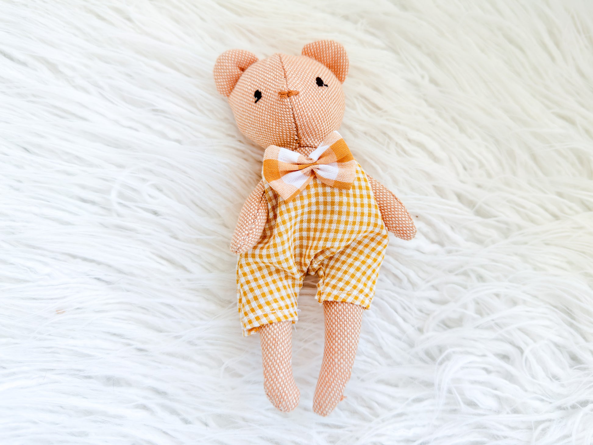 Meet our charming Marigold & Gingham Linen Bear, a delightful little companion lovingly handmade in New Zealand. Crafted from warm marigold-toned linen and dressed in a sweet yellow gingham romper with a matching bow tie, this miniature bear brings cheerful cottage charm to any nursery.
