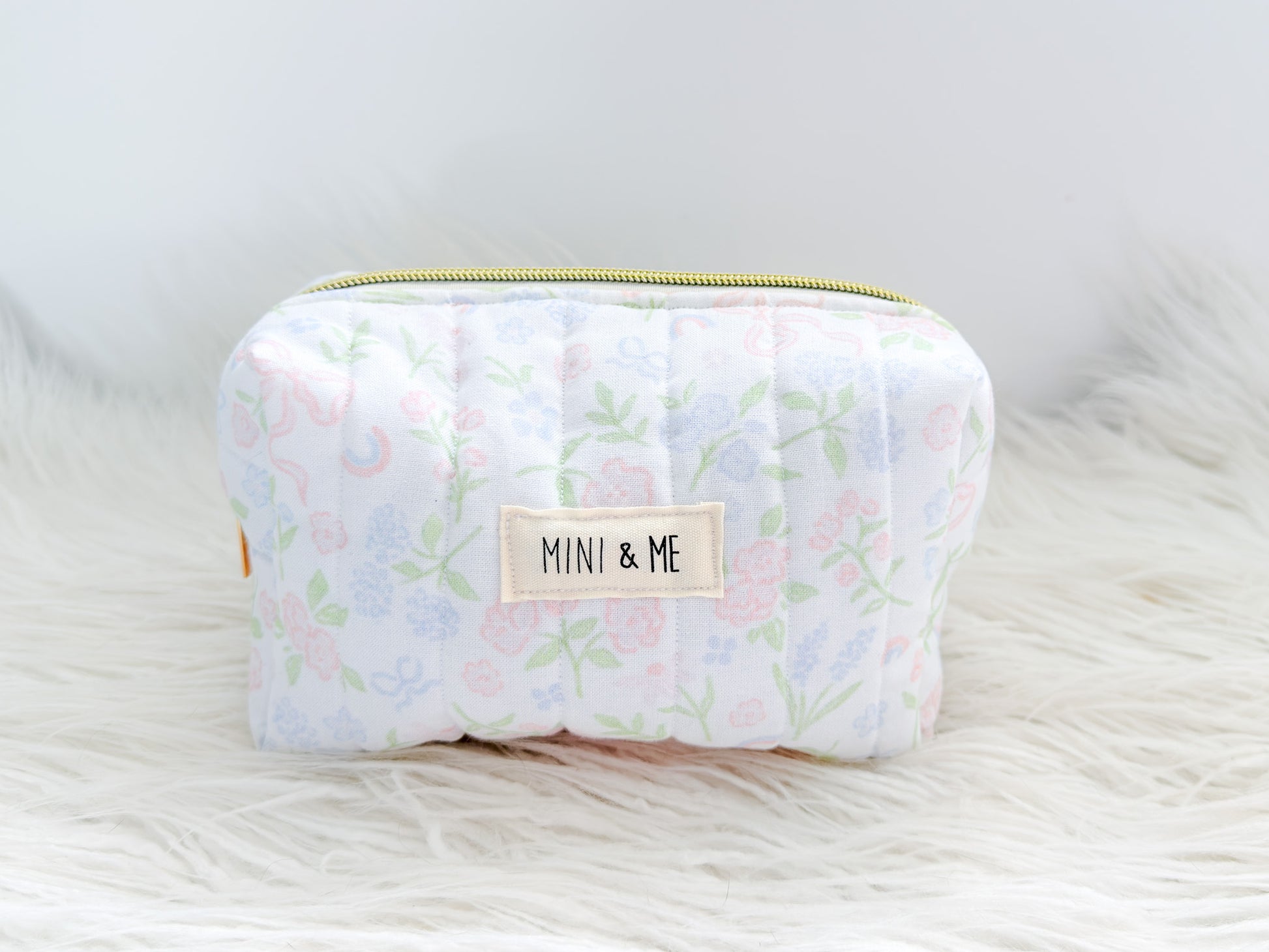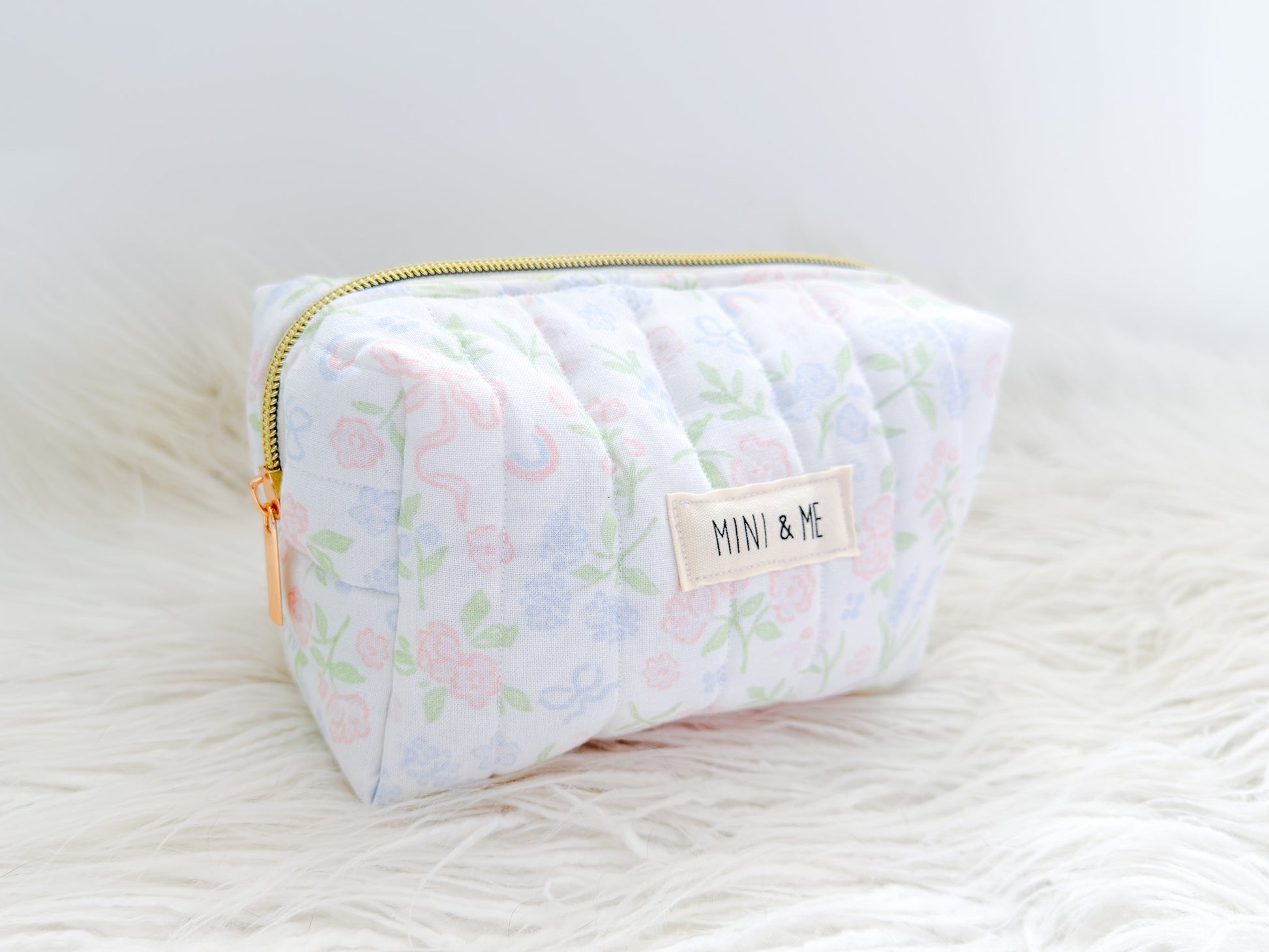 Soft, dreamy, and full of delicate cottagecore charm – our Quilted Pastel Meadow Bloom Everything Pouch is the perfect mix of style and practicality. Featuring a gentle floral print in pastel pinks, blues, and greens on soft quilted fabric and lined with smooth cotton, this pouch is ideal for keeping your makeup, skincare, craft supplies, or travel items organised.