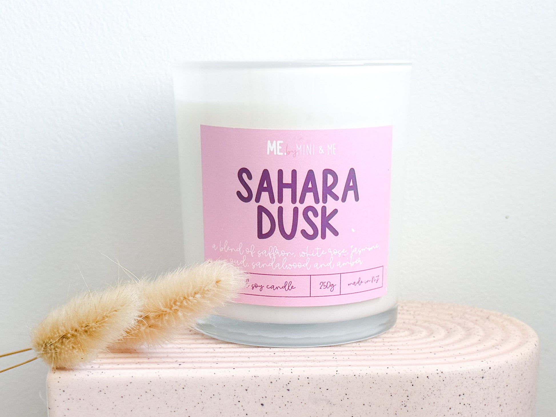 Dark, warm and hypnotic, our Sahara Dusk candle evokes the mystery of a moonlit wander through an exotic perfume souk. Rich saffron and smoky olibanum open with an intoxicating spice, drifting through warm evening air. A sensual heart of jasmine and white rose adds velvety floral depth, wrapping the fragrance in soft elegance. Deep amber, oud and sandalwood create a luxurious, resinous base — smooth, sultry and lingering, like golden dusk settling over desert sands. Hand-poured in small batches in Auckland, New Zealand, using 100% natural soy wax and a clean-burning cotton wick for a slow, even burn.