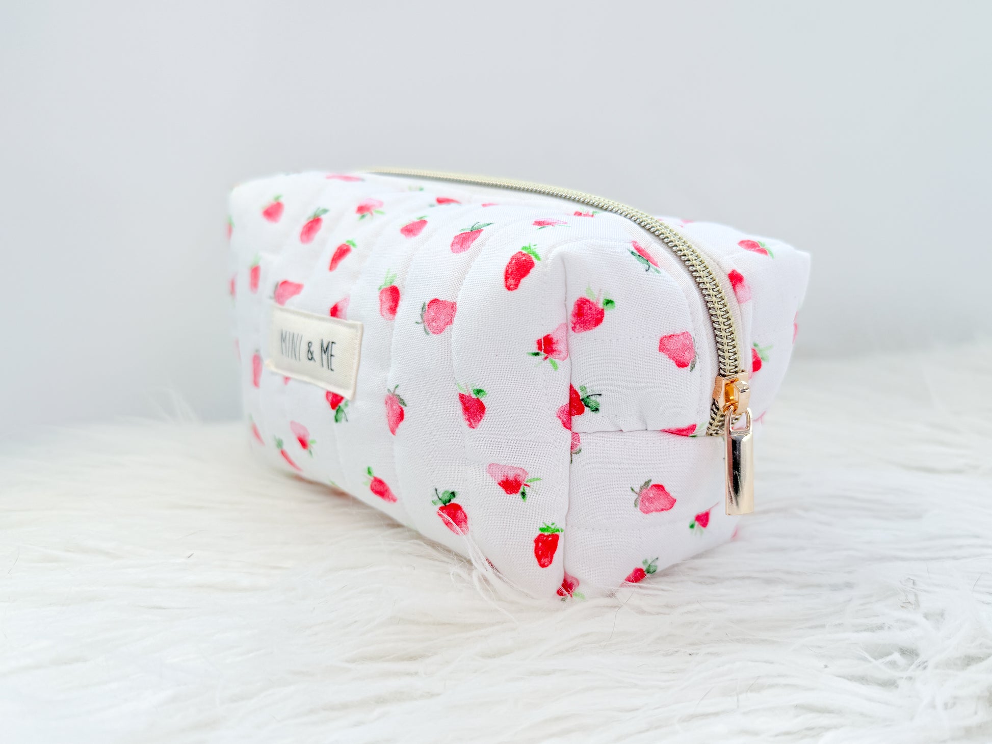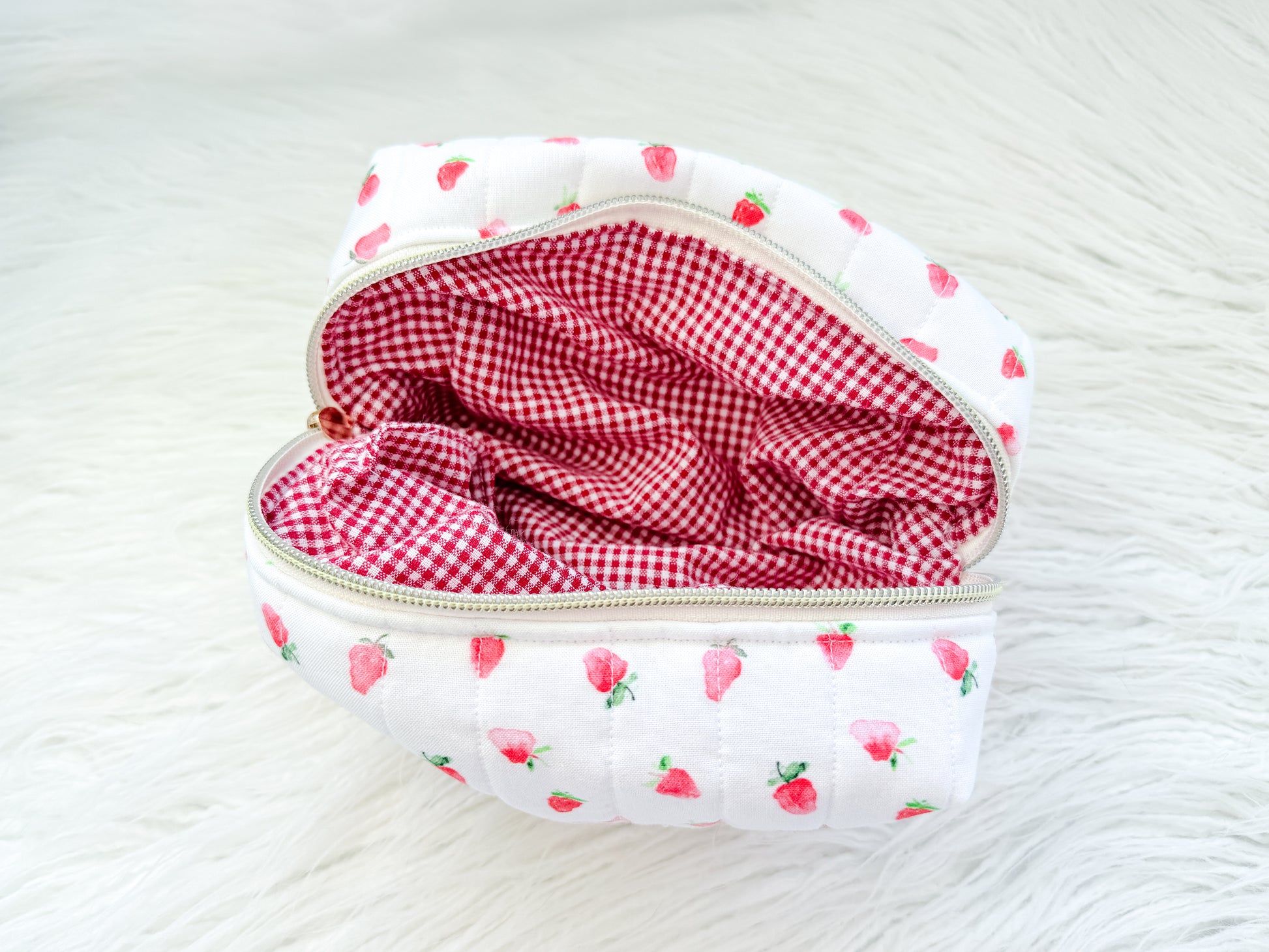 Add a burst of sweetness to your daily routine with our Quilted Strawberry Everything Pouch! Featuring an adorable strawberry print exterior and a charming red gingham cotton lining, this pouch is perfect for keeping your makeup, skincare, craft supplies, or everyday essentials organised in style.