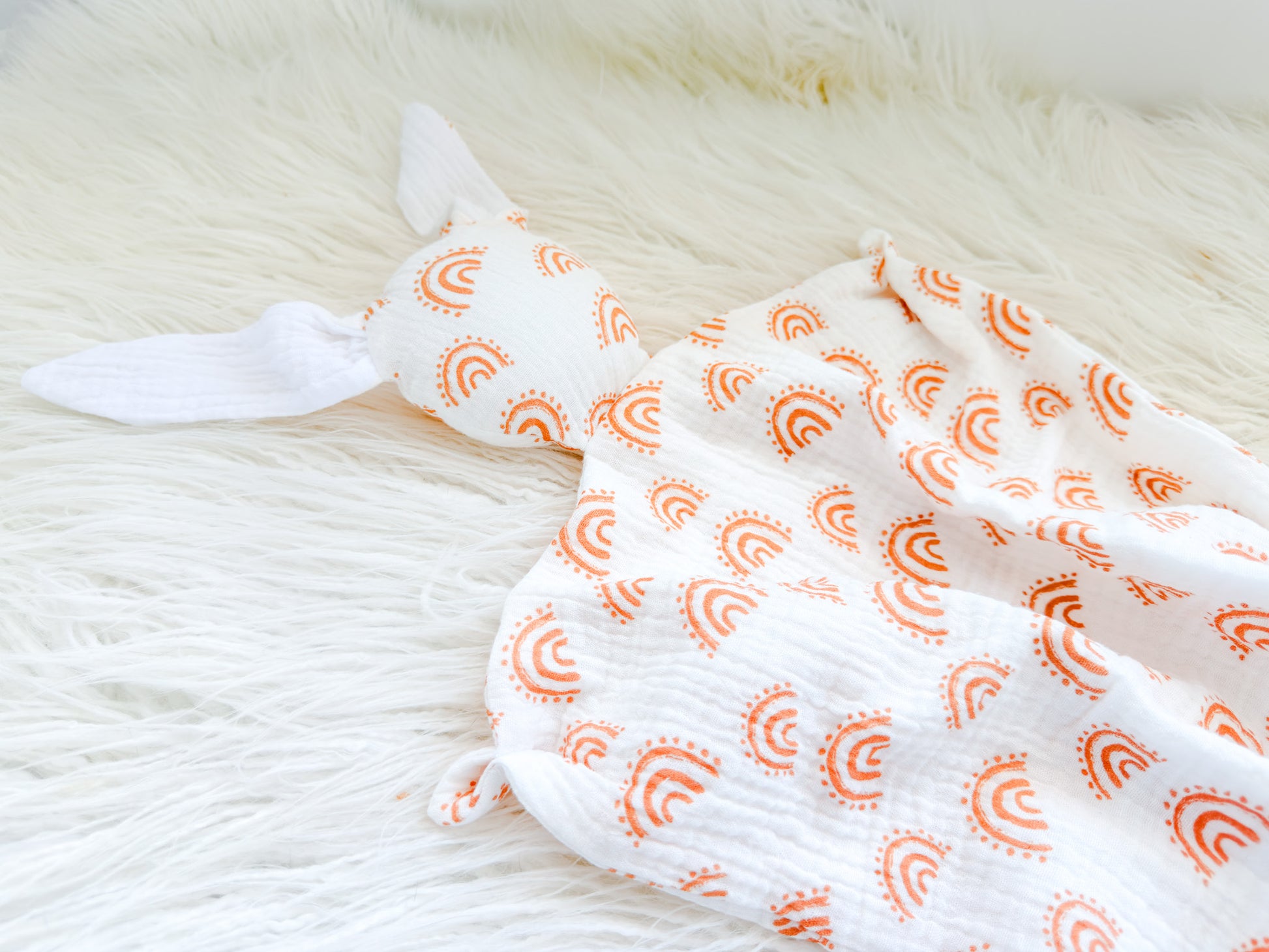 This cuddly comforter features a white muslin outer adorned with warm terracotta-orange rainbows, paired with soft white bunny ears for a modern, gender-neutral look that suits any nursery. Lightweight and easy for tiny hands to hold, it’s perfect for cot time, stroller rides or quiet cuddle moments.